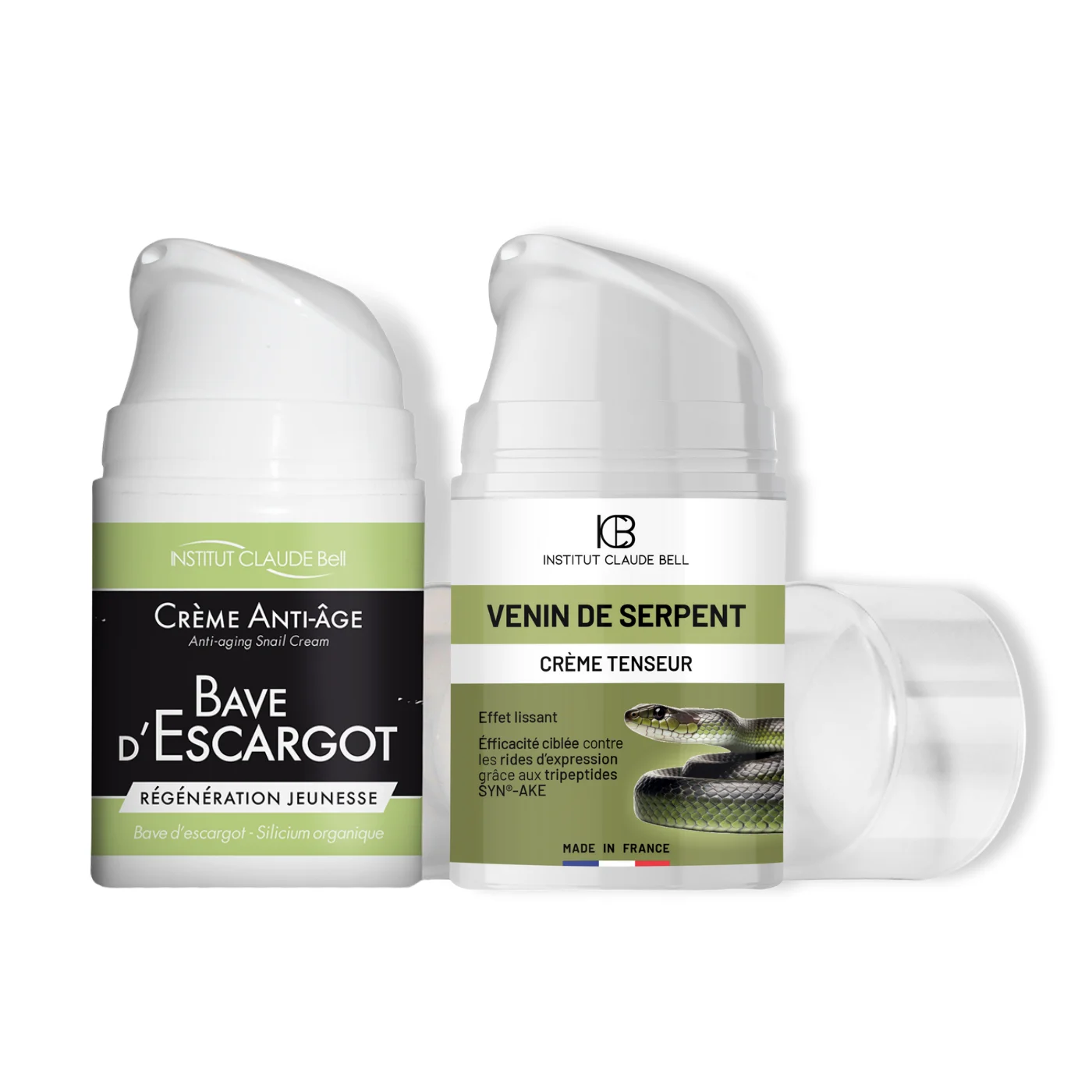 Combinatieset Anti-Aging dag- en nachtcrème met slangen- en slakkenafscheiding. Door deze unieke combinatie wordt de huid gedurende 24-uur intensief gevoed en herstelt. Gaat huidveroudering tegen en zorgt voor een egaal gladde huid.